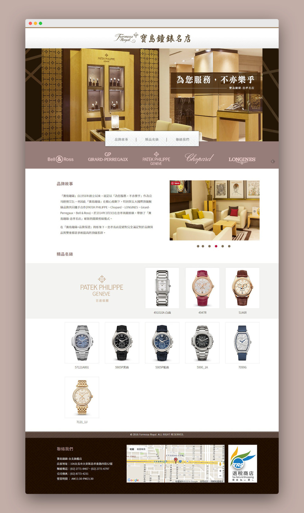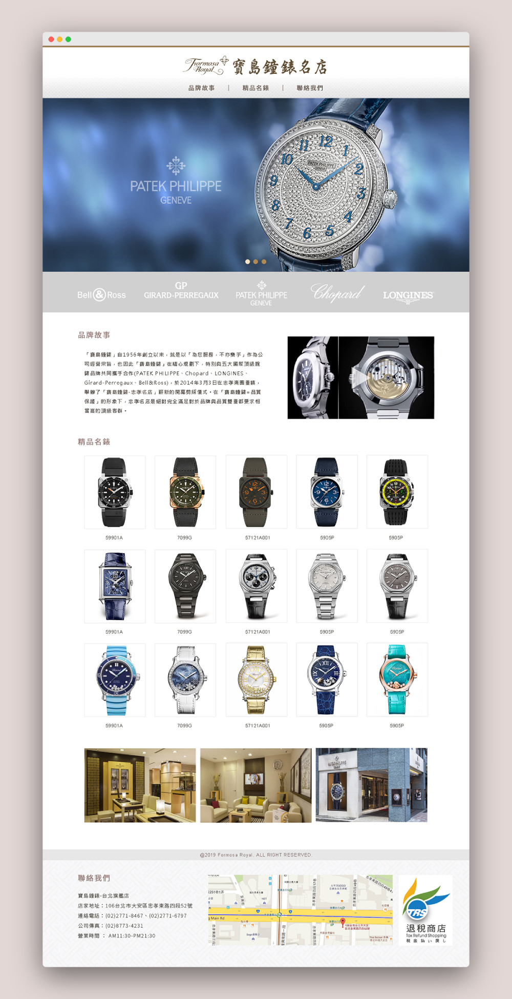 「寶島鐘錶-忠孝名店」位於人潮眾多熱鬧的東區街頭,這次委託我們進行主官網之外的活動宣傳頁面,來展示一系列的精品名錶,為配合店中精緻的裝潢氛圍,色彩選用較為沉靜典雅的搭配,考量網站資訊較為簡略,版面使用常見的一頁式結構,讓訪客可在指尖滑動中便可瀏覽全店資訊。另外,網頁也增加響應式(RWD)縮放功能,讓本站在各類尺寸的裝置中皆可完美呈現,達到資訊全面傳遞的效果。